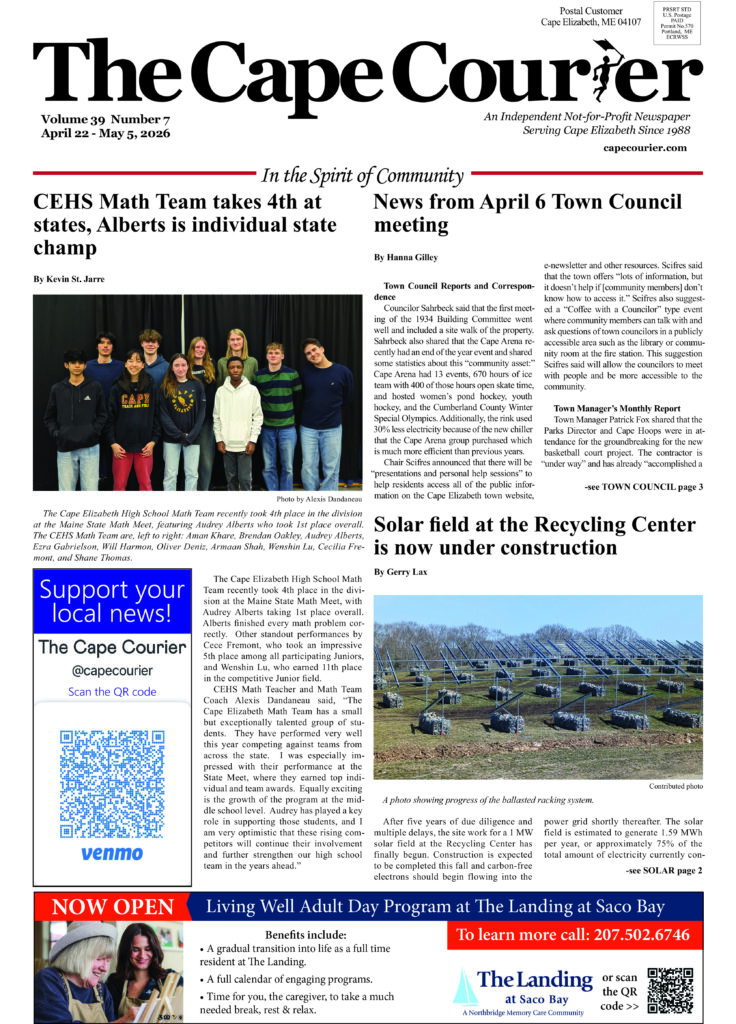 The mission of The Cape Courier is to foster a sense of community by presenting news specific and unique to Cape Elizabeth or its residents; and, whenever possible, to promote volunteerism within the community.